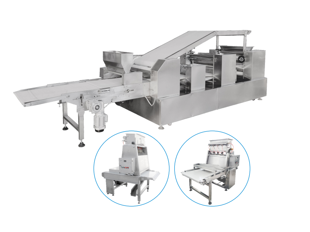 拌漿機(jī)將糖漿加熱攪拌均勻→和面→面團(tuán)擠出輸送→面餅成型→一次烘烤→噴糖→二次烘烤→冷卻