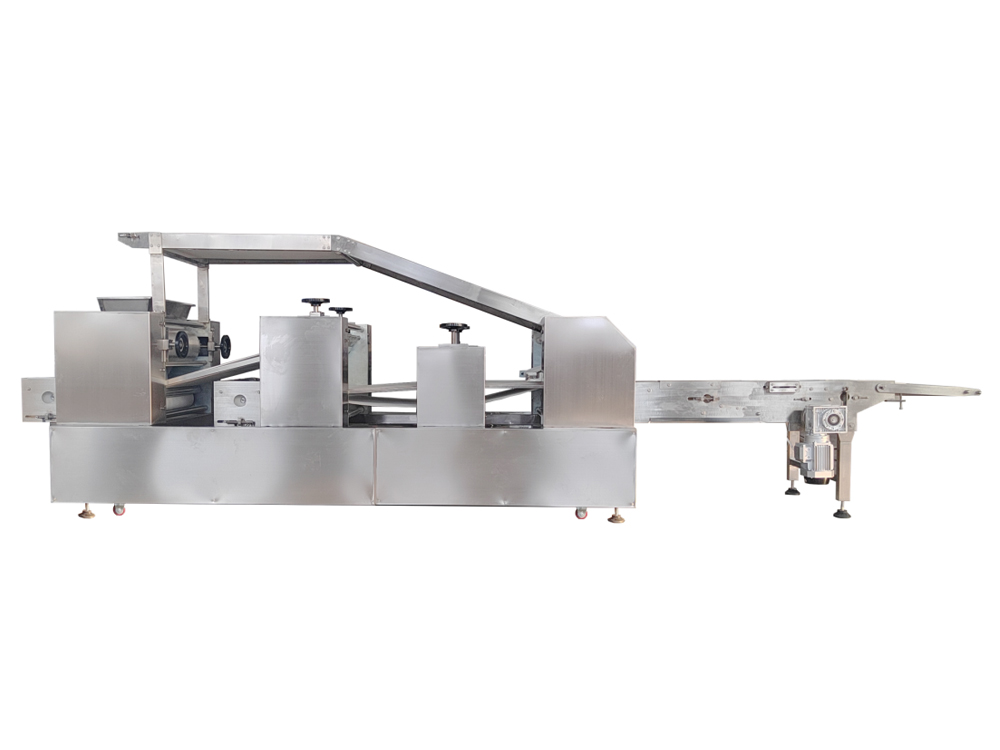 法餅成型機為臥式成型機,通過傳送機構(gòu)將各道軋輥線速度比合理分配,實現(xiàn)從投料到制皮成型自動化生產(chǎn)。